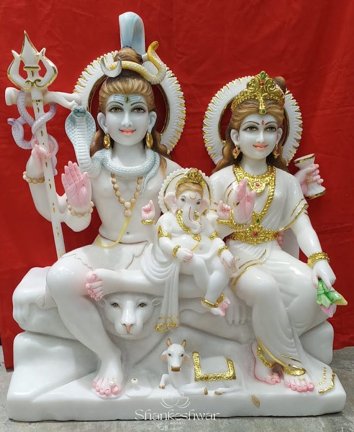 Exquisitely carved from Makrana marble, this Shiv Ji Parivar statue embodies divine family unity, strength, and spiritual harmony.